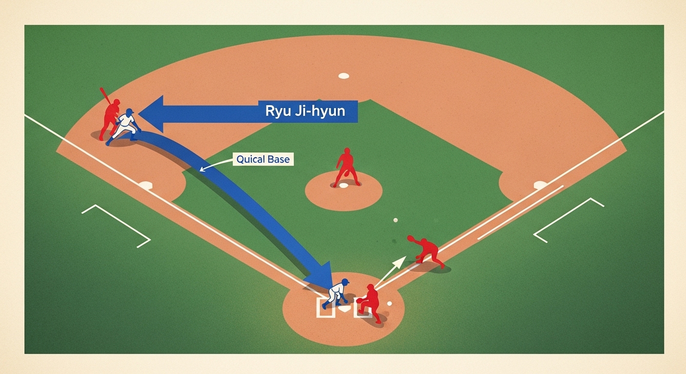 류지현 선수의 영리한 주루 플레이를 보여주는 야구 전술 다이어그램