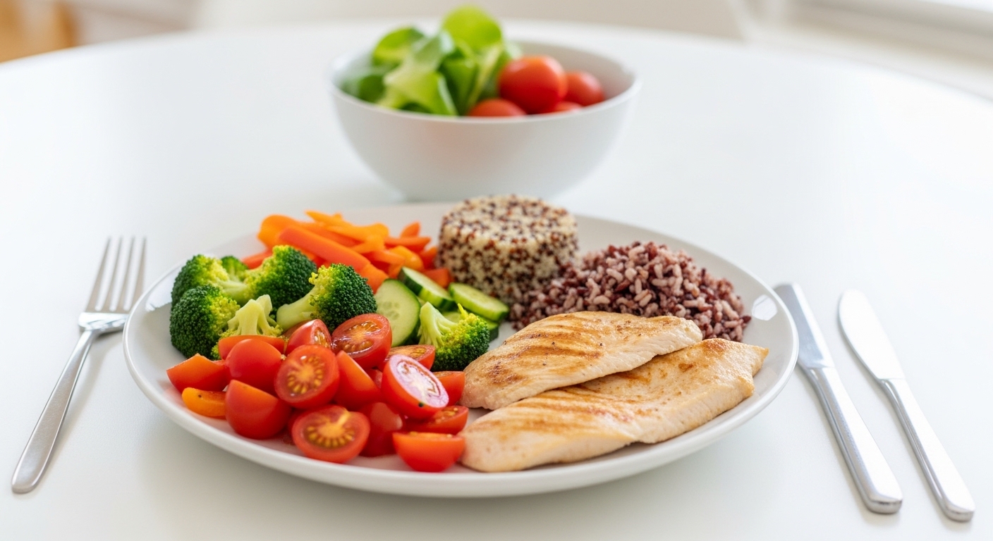 - 단백질과 채소 위주 식사: 매 끼니 단백질(닭가슴살, 생선, 두부 등)과 다양한 채소를 충분히 섭취하고, 탄수화물은 통곡물 위주로 조절하세요.